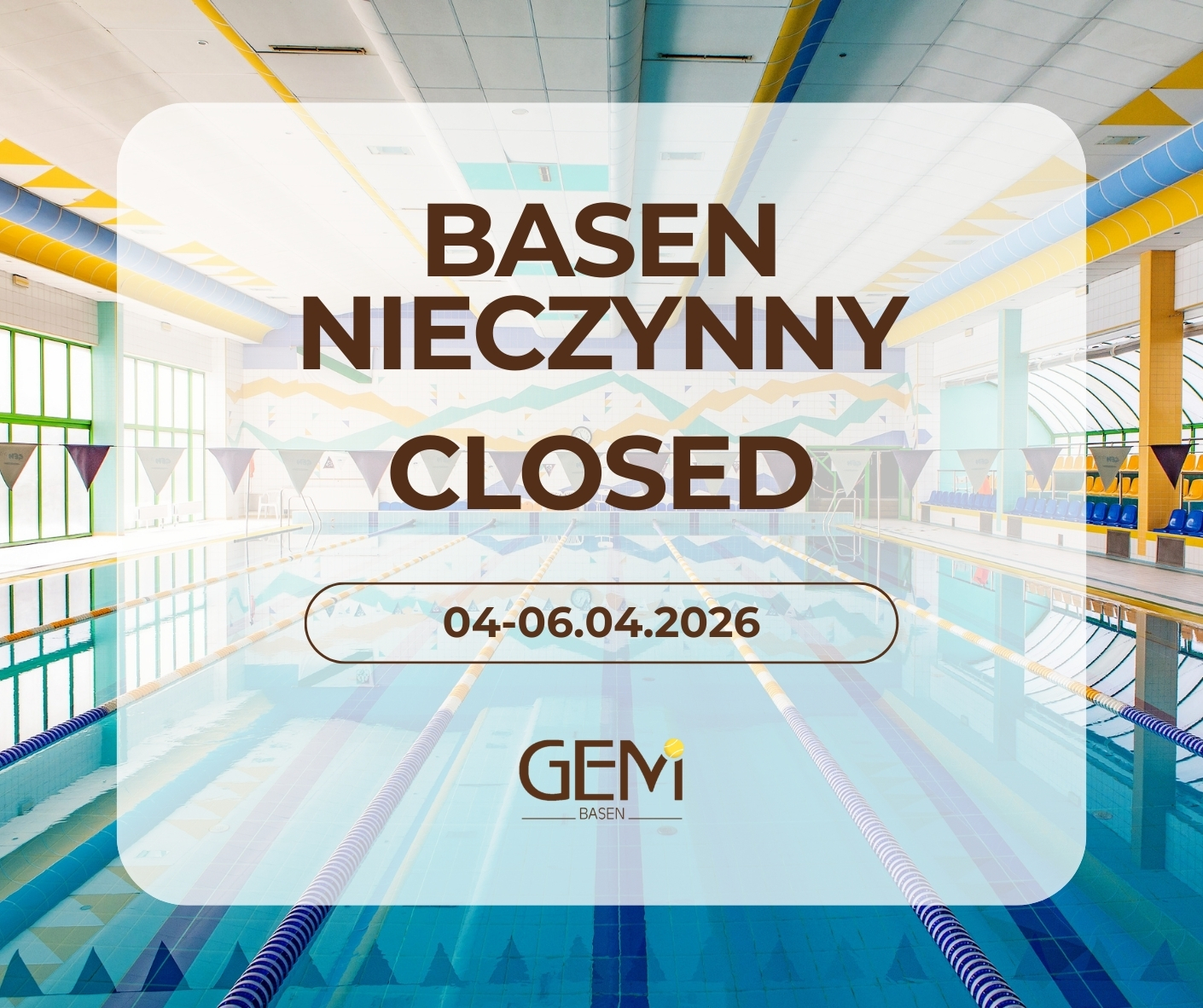 Drodzy Goście, w dniach 04–06.04.2026, w okresie świątecznym, pływalnia sportowa i sauna będą nieczynne. Przepraszamy za niedogodności i dziękujemy za wyrozumiałość.Do zobaczenia ponownie na torach już wkrótce. 🏊♂️